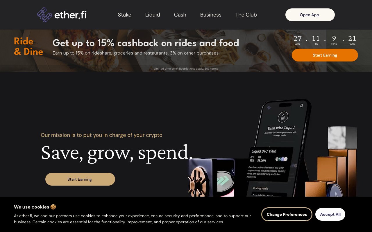 EtherFi is a non-custodial liquid restaking protocol that lets users stake ETH while retaining key ownership, with native EigenLayer restaking for additional yield on top of Ethereum consensus rewards.