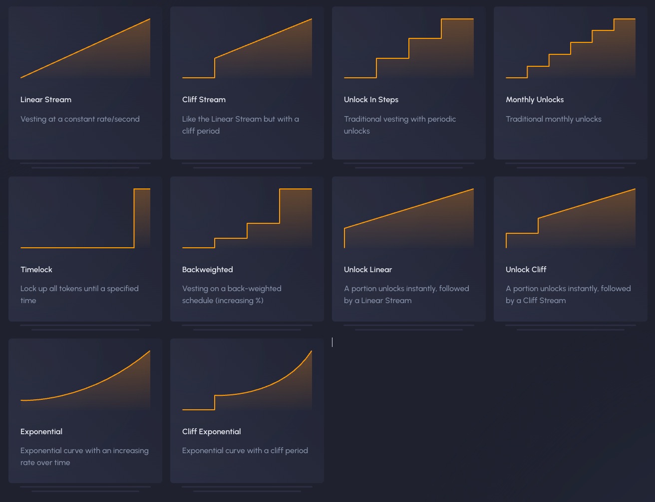 | Cliff Exponential | Cliff period followed by an accelerating exponential release | Delayed access with increasing rate over time |